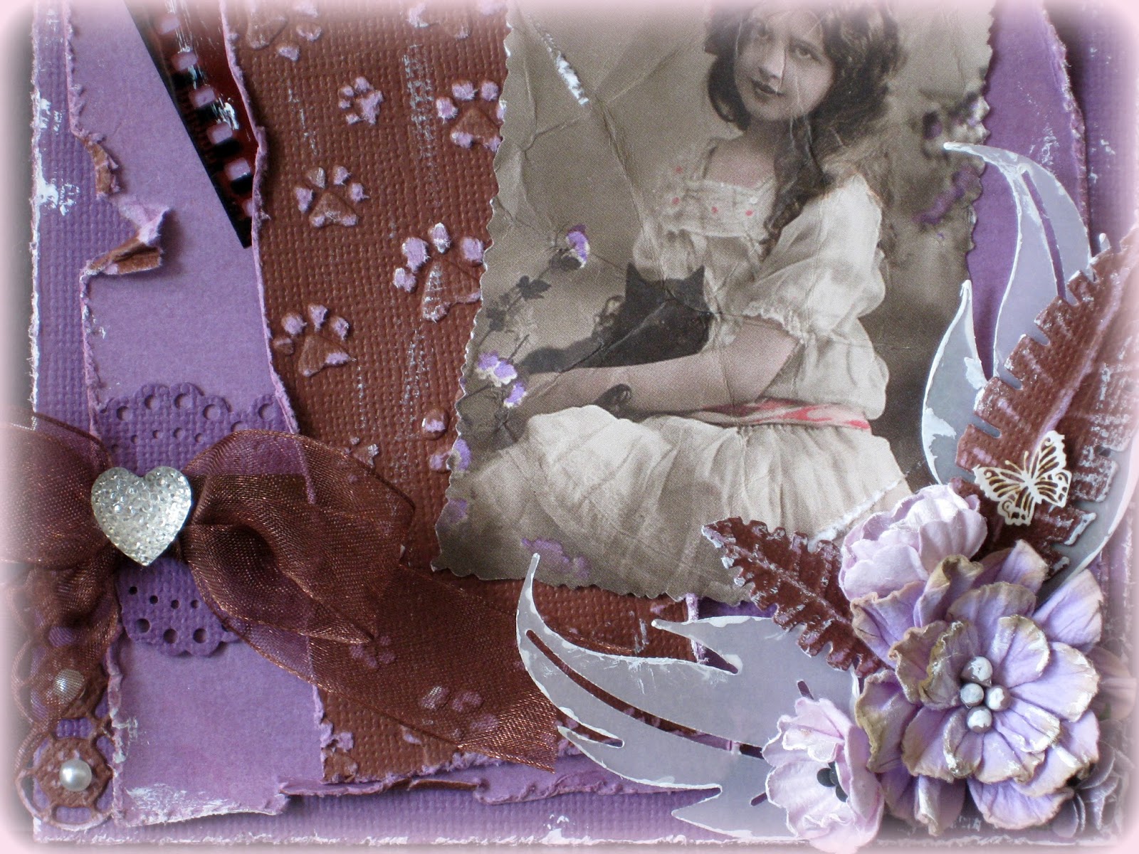 *papierblok - The Chocolatebox van ColorCore'dinations, *paars cardstock, *randpons-Martha Stewart, *embossingfolder pootjes-Marianne Design, *vintage plaatje-Studio Light RPSL07, *grote blaadjes- Vintage flourishes 6003/0037-Joy, *blaadjes-leaves-6002/0331-Joy, *hoek-Joy-6002/0379, *fotonegatief, fotorandschaar, correctievloeistof, plakparels, lint, glitterhart, bloemen, vlindertje....