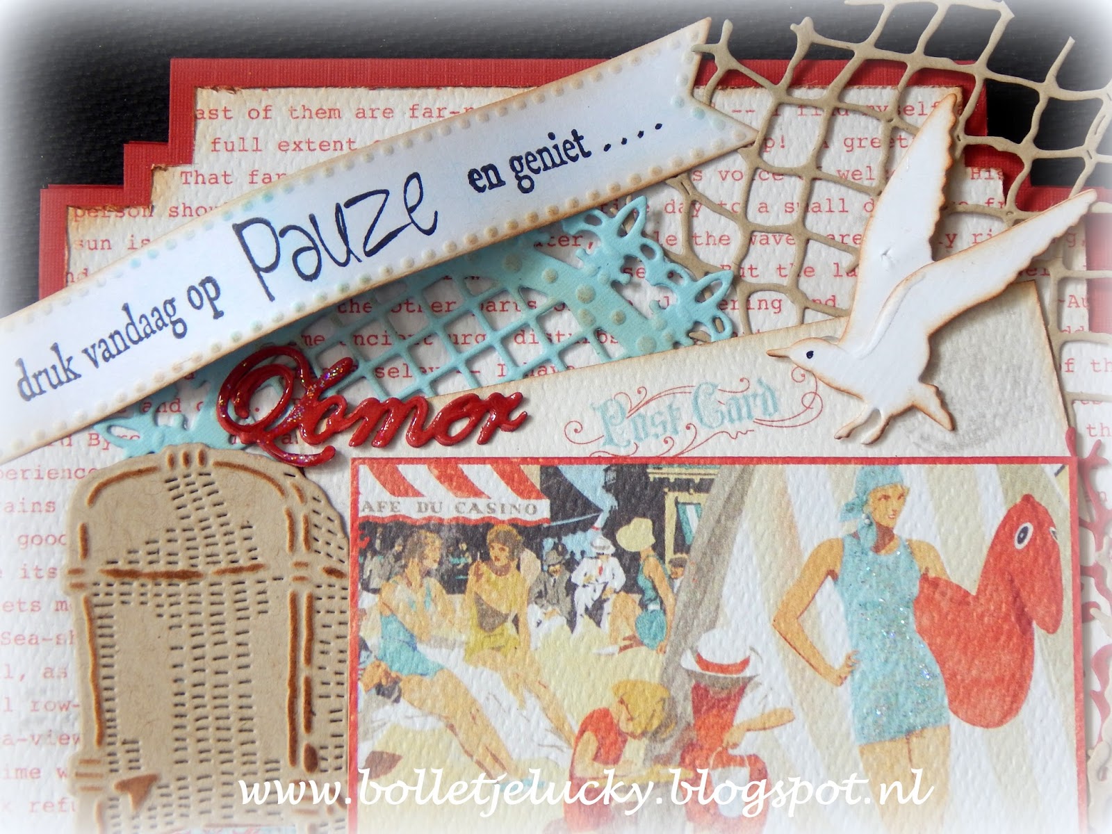 The word "summer" is diecutted twice and glued on top of each other. Some glossy accents to make it shine. The Dutch text says "push the pause-button and enjoy..."